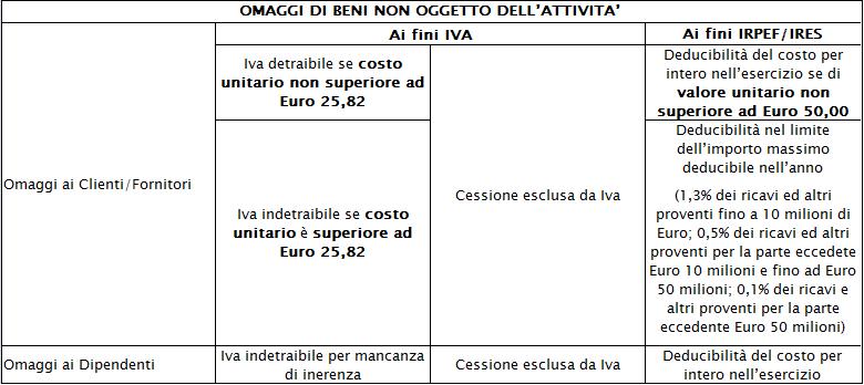 Acquisto di confezioni di beni :Se l’omaggio è rappresentato da più beni costituenti una confezione unica, per individuare il limite di Euro 25,82 è necessario considerare il costo dell’intera confezione e non quello dei singoli componenti. Di conseguenza, è indetraibile l’IVA relativa all’acquisto di un cesto regalo di costo superiore ad Euro 25,82, ancorché composto da beni di costo unitario inferiore a tale limite.