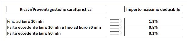- Nell’anno di sostenimento, nel limite dell’importo annuo massimo deducibile ottenuto applicando ai ricavi/proventi della gestione caratteristica (voci A.1. e A.5. del conto economico, le seguenti percentuali.