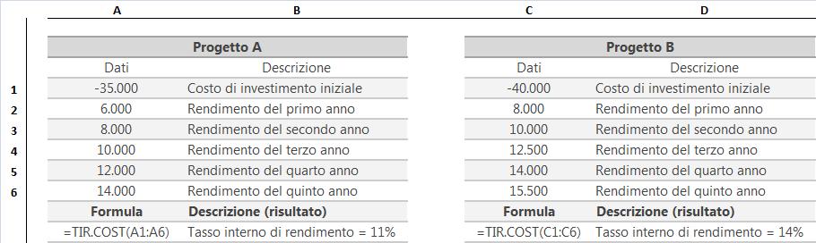 TIR – Tabella Pubblicato 3 dicembre 2012 su 910 × 272 in Uso di EXCEL per la soluzione di problemi finanziari, aziendali, economici: calcolo del Tasso interno di Rendimento (TIR) ed esempio pratico.